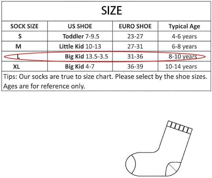 Sock Size L (10)–fits US big kids shoe size 13.5-3.5, Euro shoe size 31-36, Age approx. 8-10 years